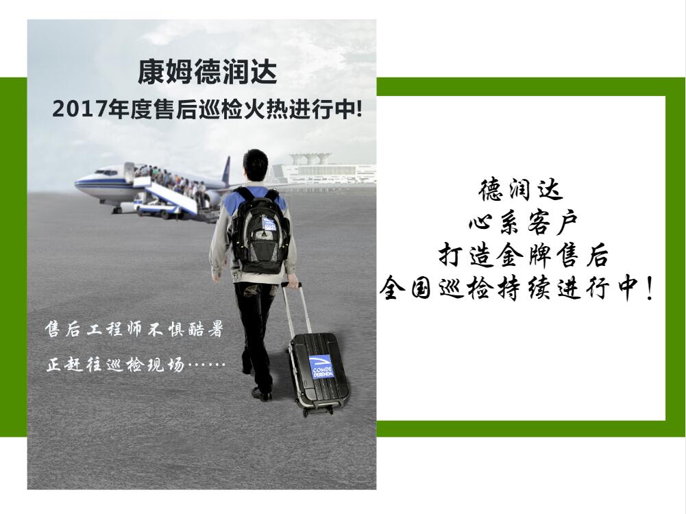?   最新動(dòng)態(tài)   ?   企業(yè)新聞   ?   2017.08.01 | 康姆德潤(rùn)達(dá)2017售后巡檢行程更新通過(guò)電子郵件推薦