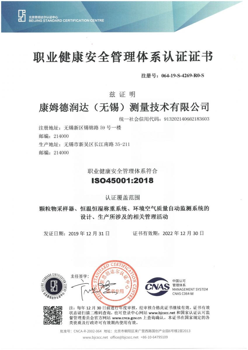 2019年12月31日,康姆德潤達(無錫)測量技術(shù)有限公司正式獲得ISO45001:2018職業(yè)健康安全管理體系認(rèn)證,這標(biāo)志著我公司在職業(yè)健康安全管理上緊貼國際先進管理模式,為公司后續(xù)的安全穩(wěn)定及可持續(xù)發(fā)展提供了強有力的保障。