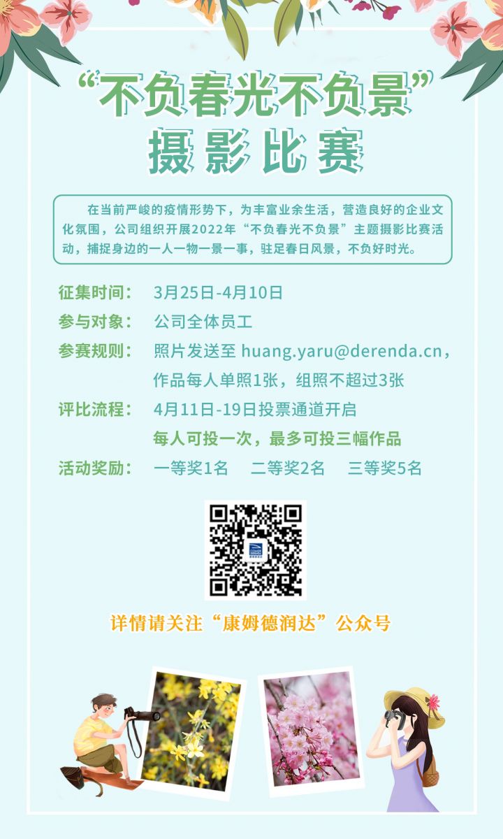 在當(dāng)前嚴(yán)峻的疫情形勢(shì)下,為豐富員工的業(yè)余生活,營(yíng)造良好的企業(yè)文化氛圍,康姆德潤(rùn)達(dá)組織開展2022年“不負(fù)春光不負(fù)景”主題攝影比賽活動(dòng),捕捉身邊的一人一物一景一事,駐足春日風(fēng)景,不負(fù)好時(shí)光。