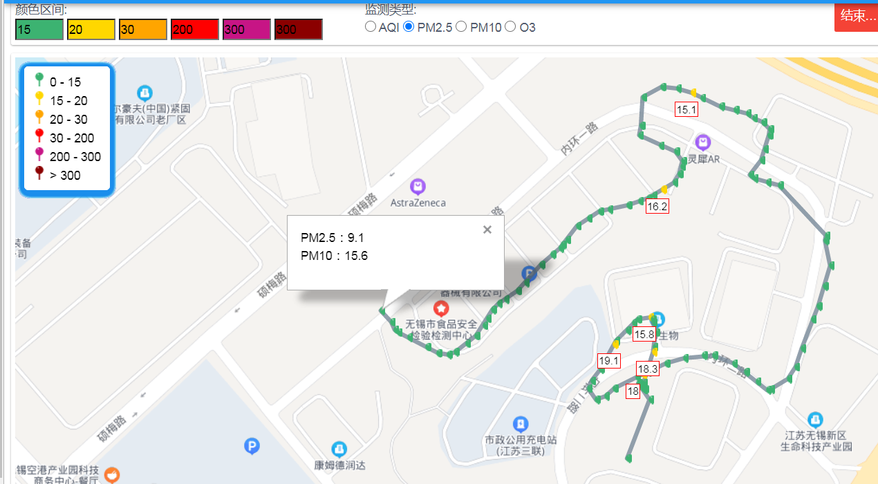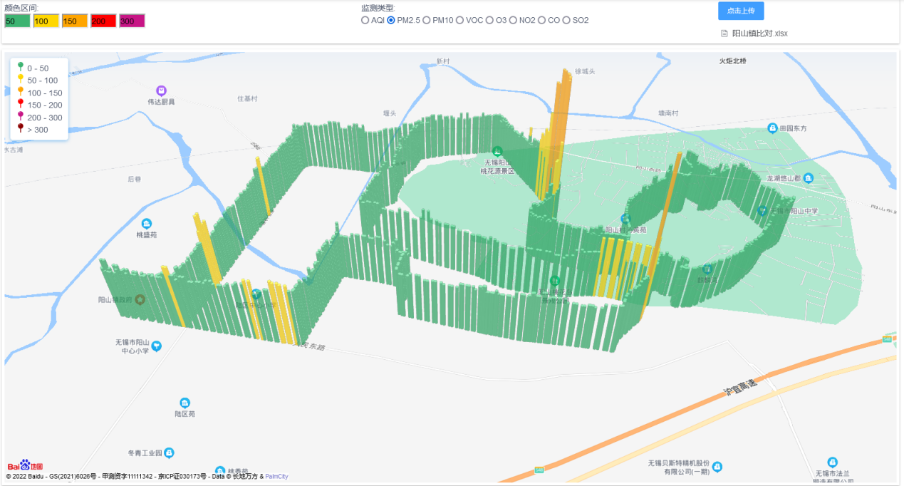支持實(shí)時(shí)走航軌跡和歷史走航軌跡,實(shí)時(shí)走航軌跡為2D點(diǎn)狀圖;歷史走航支持在線和離線走航數(shù)據(jù)切換,勾畫對(duì)應(yīng)地圖軌跡,走航地圖標(biāo)記3D柱狀圖,柱狀體的顏色與設(shè)置的顏色區(qū)間相對(duì)應(yīng),柱狀體的高度對(duì)應(yīng)監(jiān)測(cè)的顆粒物的值大小