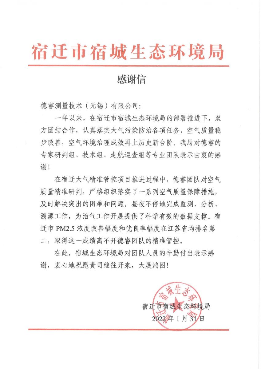 2021-2022年期間,宿遷市緊緊圍繞省大氣考核指標(biāo),認(rèn)真落實(shí)大氣污染防治各項(xiàng)任務(wù),空氣質(zhì)量穩(wěn)步改善,空氣治理成效再上歷史新臺(tái)階。歲末,宿遷市宿城生態(tài)環(huán)境局發(fā)來感謝信,感謝德睿團(tuán)隊(duì)對空氣質(zhì)量精準(zhǔn)研判,嚴(yán)格組織落實(shí)了一系列空氣質(zhì)量保障措施,及時(shí)解決突出的困難和問題,晝夜不停地完成監(jiān)測、分析、溯源工作,為項(xiàng)目提供了科學(xué)有效的數(shù)據(jù)支撐。