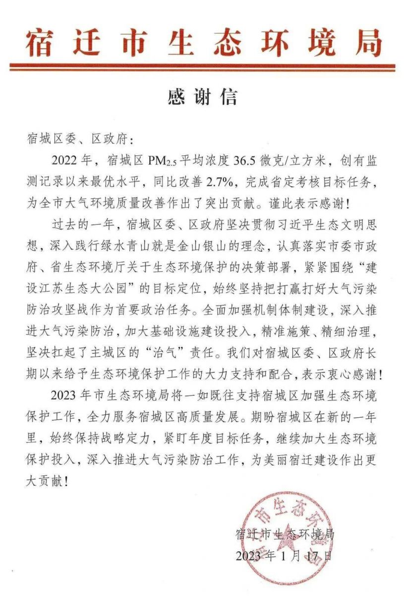 1月18日,宿遷市生態(tài)環(huán)境局向宿城區(qū)委、區(qū)政府表示感謝:“2022年,宿城區(qū)PM2.5平均濃度36.5微克/立方米,創(chuàng)有監(jiān)測(cè)記錄以來(lái)最優(yōu)水平,同比改善2.7%,完成省定考核目標(biāo)任務(wù),為全市大氣環(huán)境質(zhì)量改善作出了突出貢獻(xiàn)。謹(jǐn)此表示感謝!”。