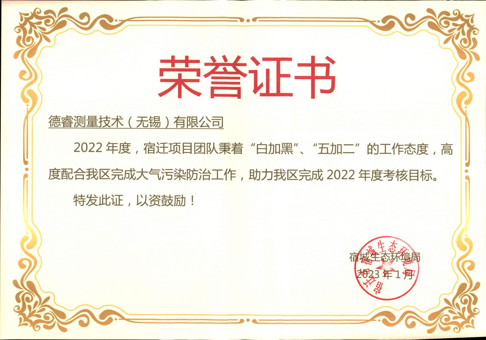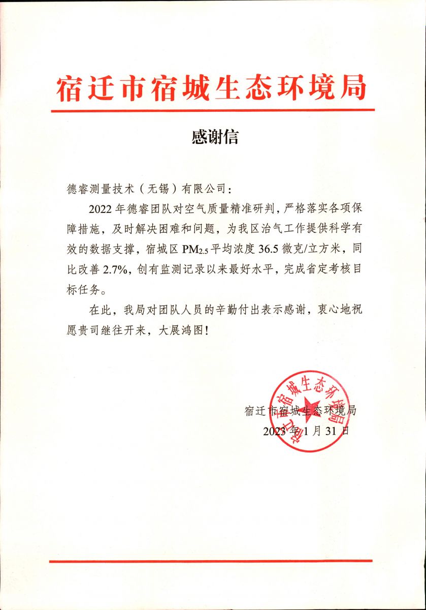 德睿測(cè)量技術(shù)(無(wú)錫)有限公司每年都會(huì)收到宿遷市宿城生態(tài)環(huán)境局的感謝信,充分肯定了團(tuán)隊(duì)為宿遷市空氣質(zhì)量改善所作出的積極貢獻(xiàn)。